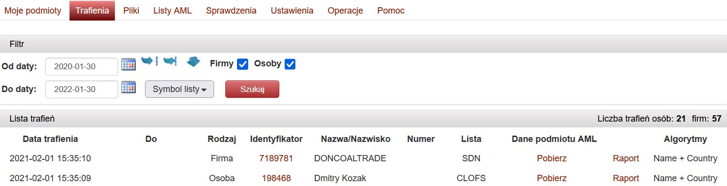 - Trafienia - pobranie listy Kontrahentów z trafieniami w bazie AML zadanym okresie.