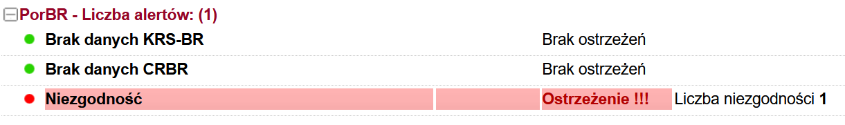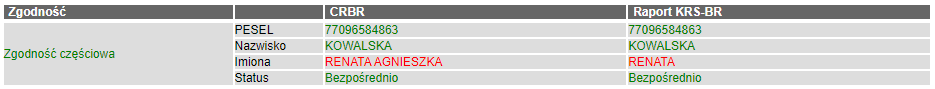 - zgodność częściowa - w bazie KRS oraz CRBR znajdują się dane tych samych osób, lecz różnią się między sobą np. niepodanie drugiego imienia, czy też wskazany inny rodzaj udziałów,