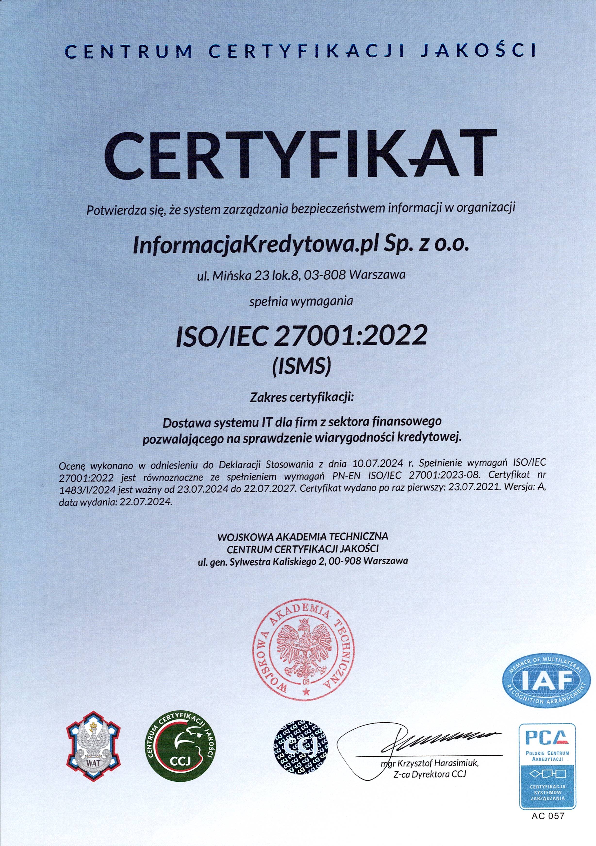 Międzynarodowy Certyfikat System Zarządzania Bezpieczeństwem Informacji zgodny z ISO/IEC 27001:2017 (ISMS), potwierdza poważne traktowanie przez naszą Spółkę kwestii bezpieczeństwa informacji oraz utrzymania jakości usług. ISO/IEC 27001 określa wymagania i zasady: wdrażania, monitorowania, zarządzania bezpieczeństwem informacji w firmie. Bezpieczna informacja to poufność (dostęp tylko dla osób uprawnionych), integralność (dokładność i kompletność), dostępność (dostęp do zasobów, zgodnie z określonymi potrzebami). Jednostka certyfikująca: Centrum Certyfikacji Jakości (CCJ) WAT