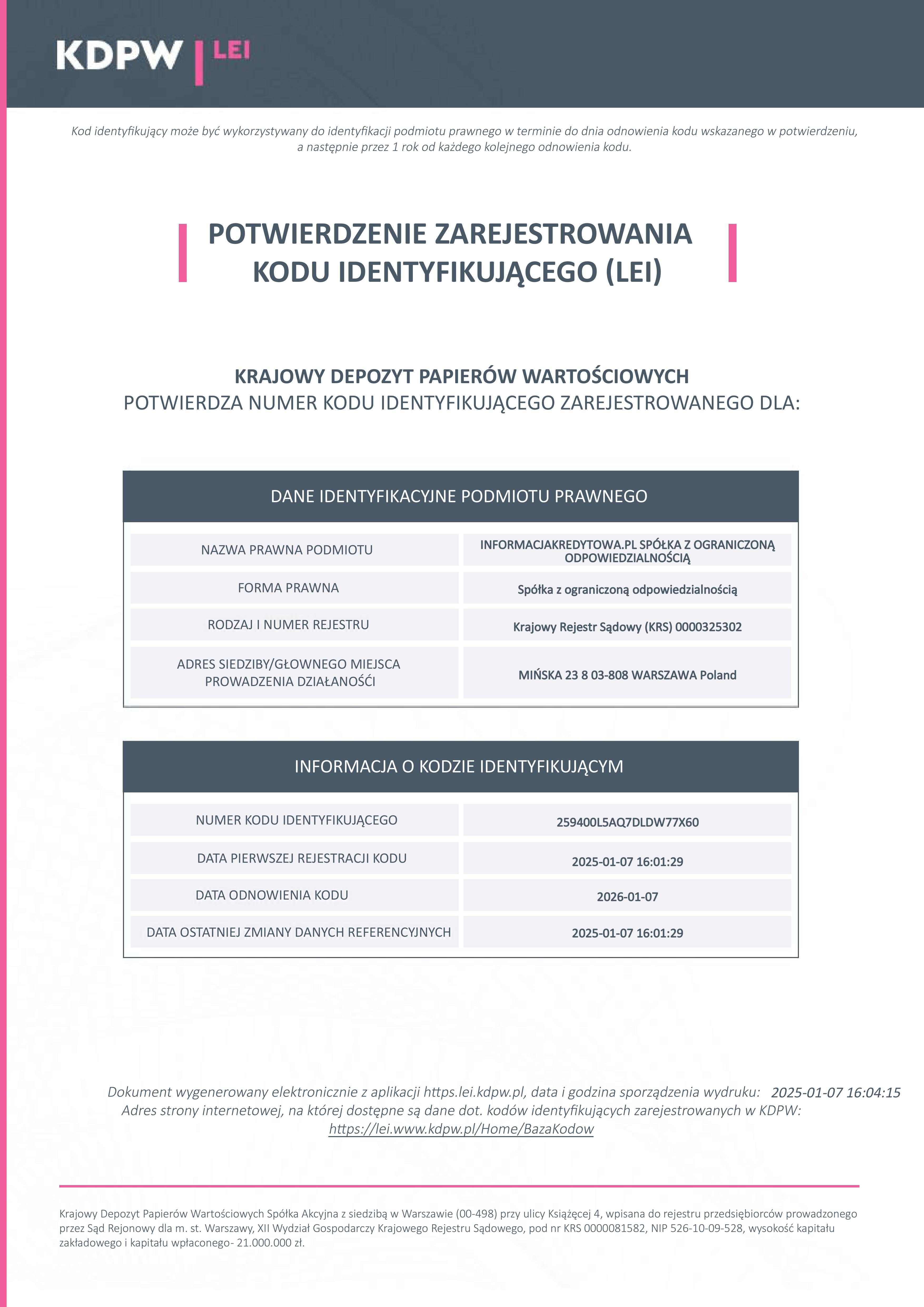 Certyfikat wydany przez Krajowy Depozyt Papierów Wartościowych S.A. dla jest potwierdzeniem wydania kodu LEI dla InformacjaKredytowa.pl Sp. z o.o. Kod identyfikacyjny podmiotu prawnego lub numer LEI to unikalny globalny numer identyfikacyjny firmy, który jest wydawany przez lokalną jednostkę operacyjną akredytowaną przez GLEIF (Global Legal Entity Identifier Foundation). Instytucje finansowe i organy regulacyjne używają LEI do identyfikacji uczestników rynków finansowych.