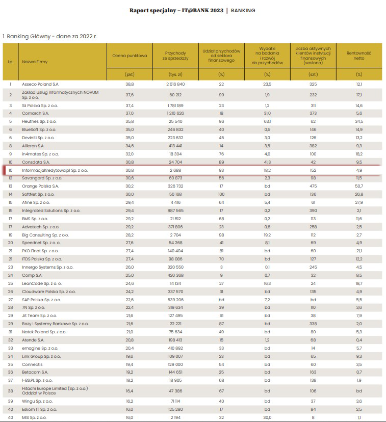 Zajęliśmy 10 miejsce na 50 badanych podmiotów w rankingu głównym dla firm technologicznych, dostawców rozwiązań z branży finansowej, organizowany przez Miesięcznik Finansowy BANK (listopad 2023)