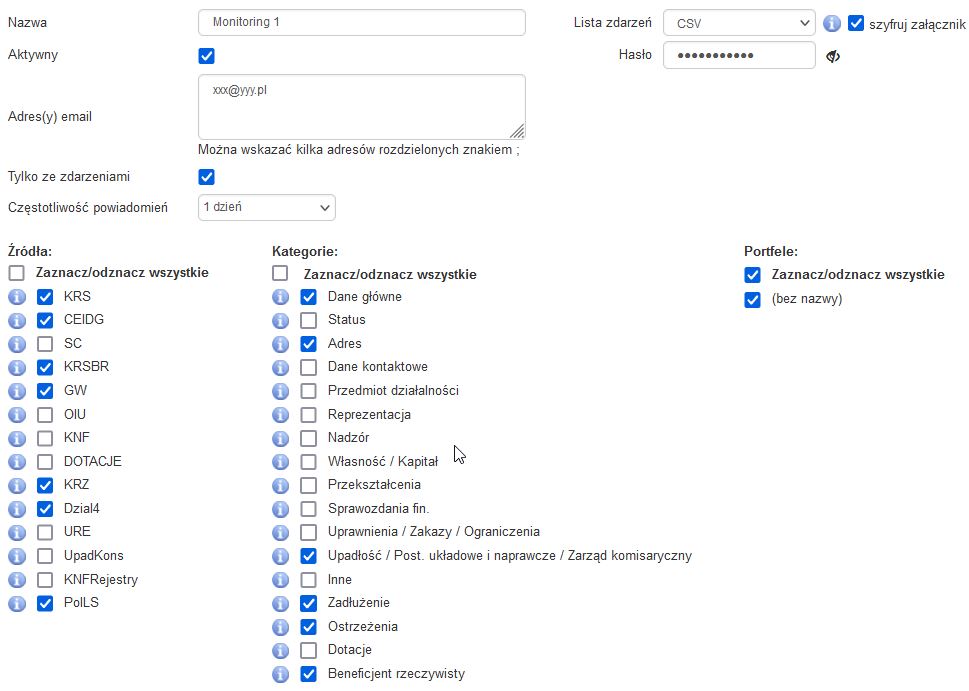 Użytkownik jest powiadamiany komunikatem e-mail, z wybraną częstością np. codziennie, raz w tygodniu, raz w miesiącu o zdarzeniach, jakie wystąpiły dla portfela monitorowanych podmiotów. Przykład ustawień Profilu monitoringu: