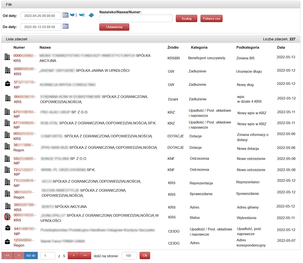 Usługa Monitoring Podmiotów dostępna w Serwisie Portal KRS umożliwia bieżące monitorowanie portfela podmiotów (Kontrahentów, Dostawców) pod kątem wystąpienia zmian, które mogą mieć wpływ na współpracę. Użytkownik samodzielnie wybiera listę monitorowanych źródeł oraz odpowiadające im kategorie zdarzeń. Dla poszczególnych źródeł dostępne są poniższe zdarzenia: