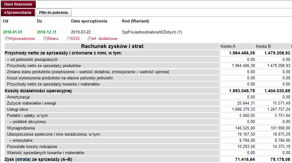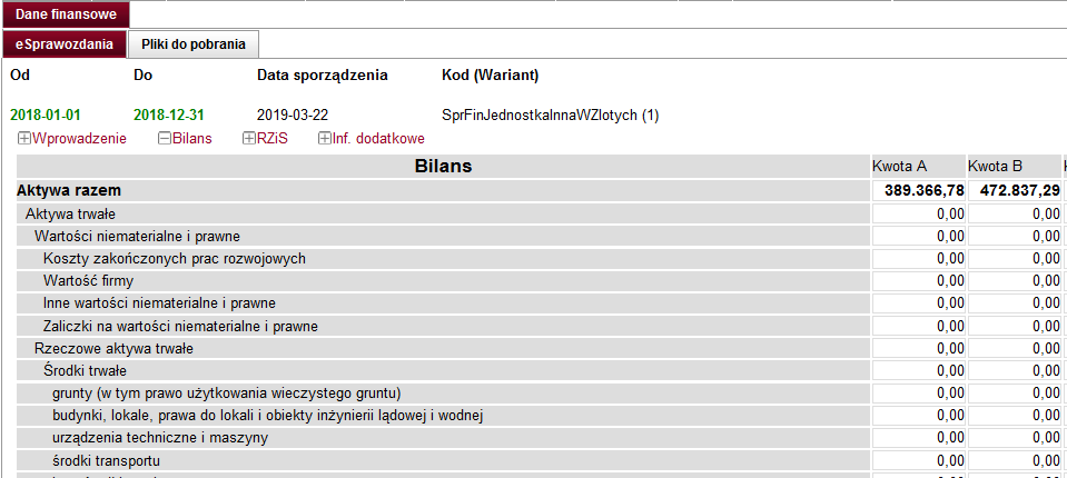 Raport KRS > Dane Finansowe > eSprawozdania /Bilans oraz RZiS - zawiera prezentację danych finansowych (źródło: PortalKRS.pl)