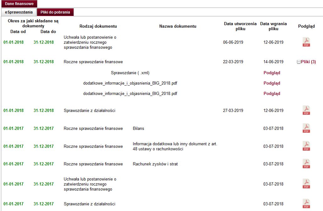 Raport KRS > Dane Finansowe > Pliki do pobrania ? zawiera zarówno XML źródłowy, jak też wszystkie dokumenty dostępne dla podmiotu w KRS, np. sprawozdania za wcześniejsze okresy w pdf. (źródło: PortalKRS.pl)
