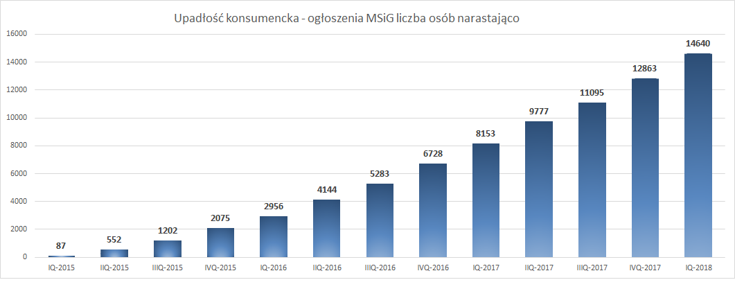 Wykres przedstawia dynamikę przyrostu ogłoszeń o upadłości konsumenckiej publikowanych w MSiG po wejściu w życie nowelizacji Ustawy w styczniu 2015 r.